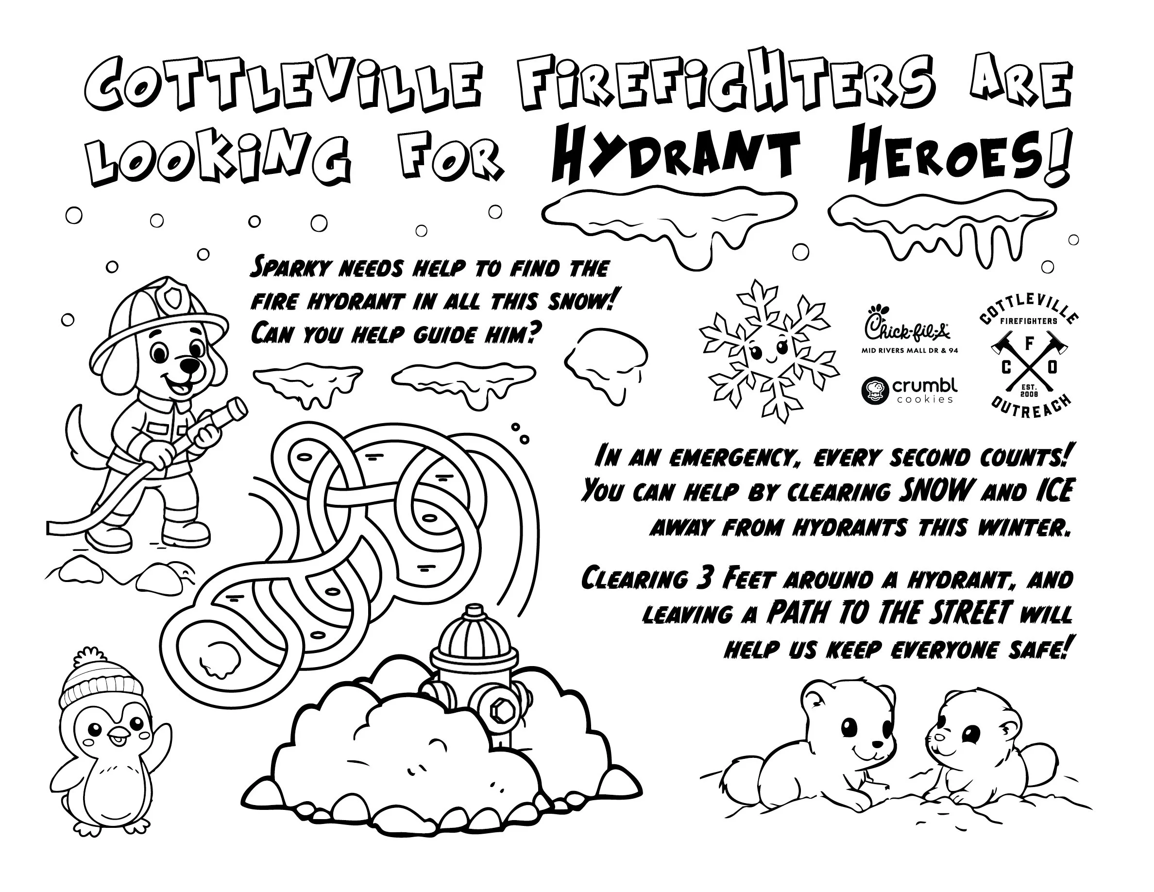 Show off your hard work! Send us a picture of your family clearing the snow here: https://forms.gle/AcoFnKLv33YKDKWL8, or on our social media by tagging @CottlevilleFirefightersOutreach and we’ll send you a coupon for a treat at Chick-Fil-A or Crumbl Cookies on Mid Rivers Mall Dr! Don’t forget to include #CFOHydrantHero to inspire your friends and neighbors as well!